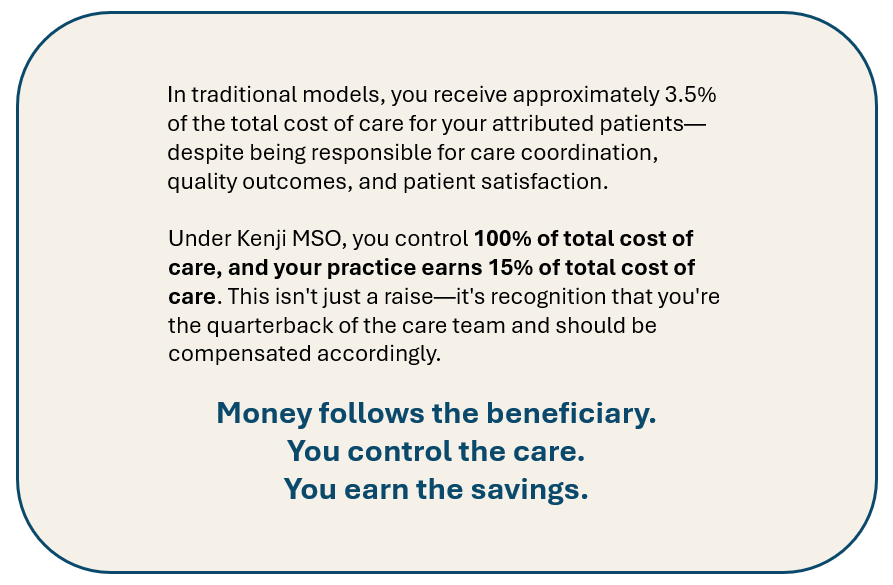 Kenji MSO fundamentally reshapes how primary care physicians and advanced practice providers (APPs) are compensated and empowered. You move from reactive care coordination to true leadership—with the financial recognition and support infrastructure that makes it sustainable.